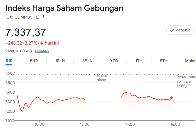 IHSG ditutup turun 3,27 persen ke level 7.337 pada perdagangan Senin (9/3). Mayoritas sektor melemah dan rupiah ikut tertekan mendekati Rp 17.000 [594] url asal